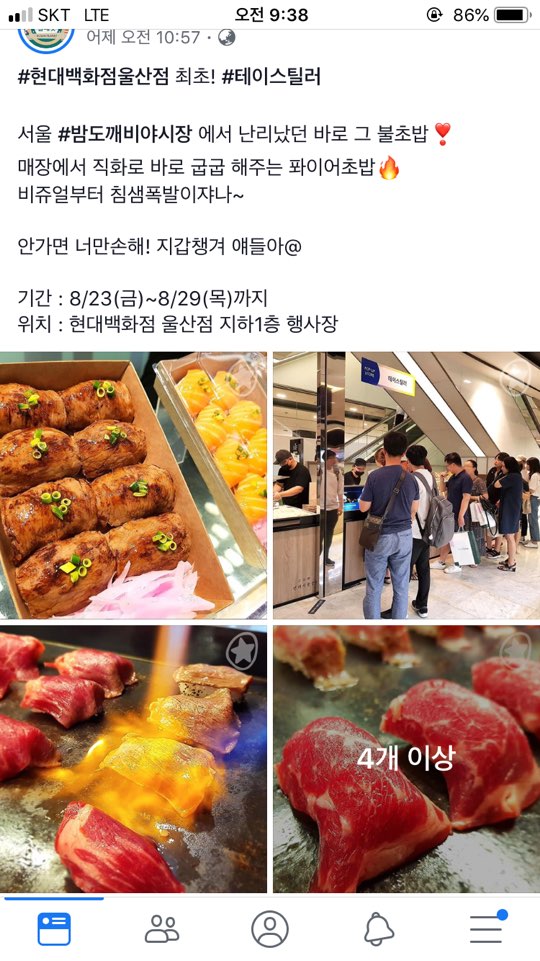 페이스북에 이 글을보고 바로 현대백화점 울산점 지하 1층으로 내려갔습니다. 어딘지 찾아보지않아도 줄이 긴곳이 보여서 봤더니 여기가 그 초밥파는곳이더라고요.